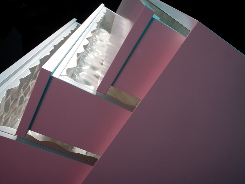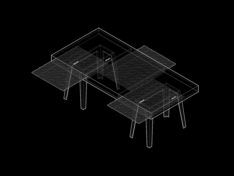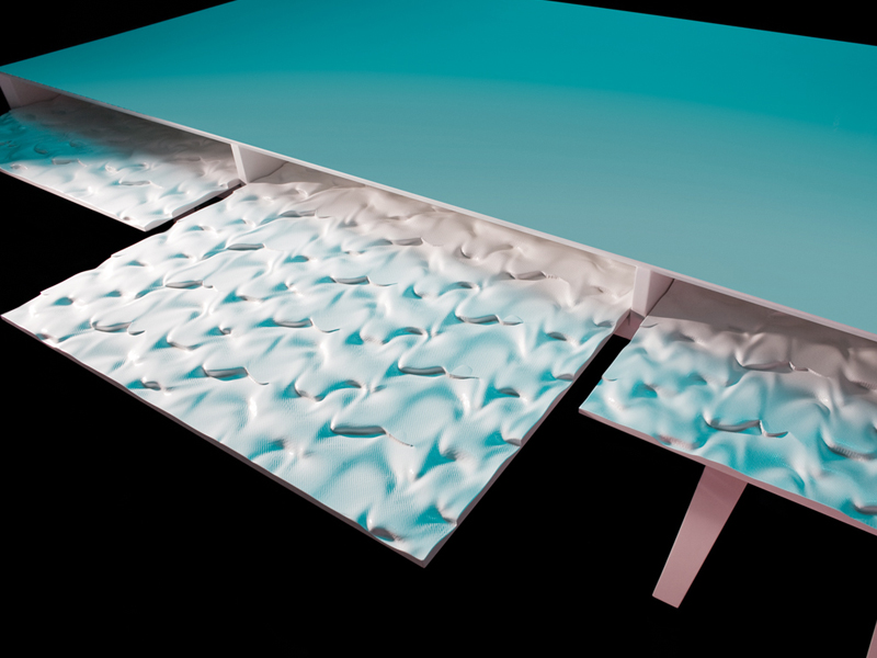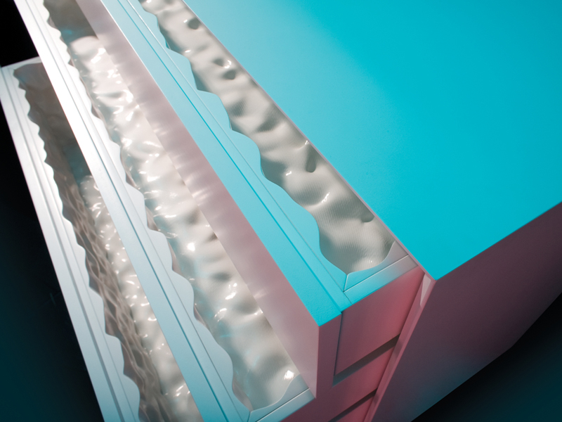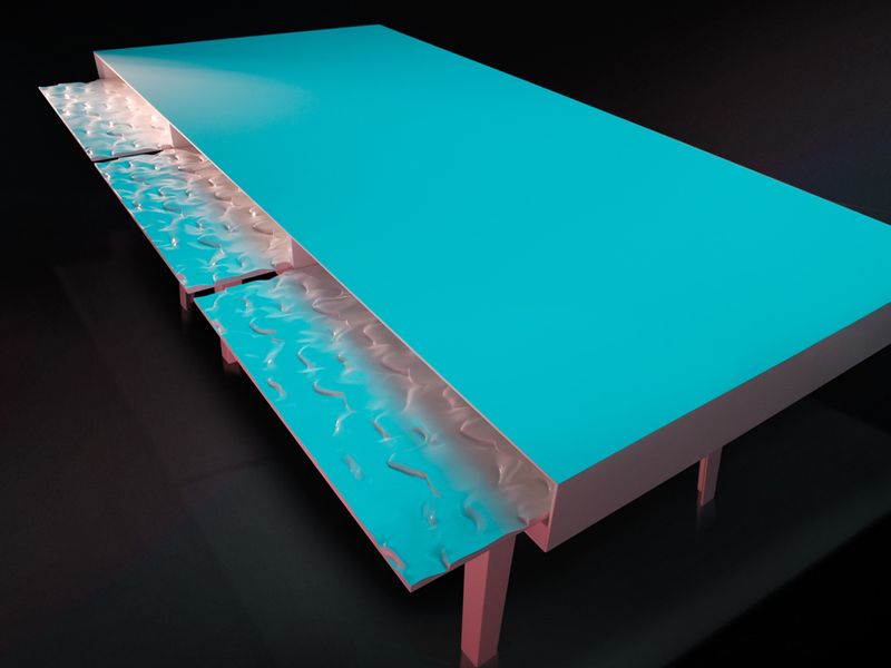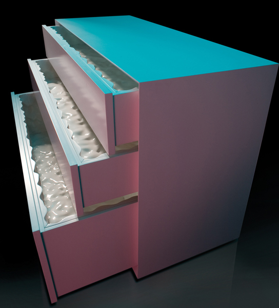 Like the opening of an animal, it is the moving parts of the 'Lard Series' that enable the greatest moments of surprise. In the case of the bureau, the exterior finish is discretely detailed with a minimalist’s sense of precision. With a soft push of a drawer, a dampened spring exposes the exquisite insides in glossy white. In the case of the table, a hint of lard peaks from beneath a flat polished table-top. The retracted table leaf below reveals itself fully when extended like a glistening textured tongue. In the 'Lard Series', the mechanisms are not at the service of the high-tech or the purely mechanical but rather they are the means by which a simple piece of furniture can evoke an intense sense of cinematic surprise.