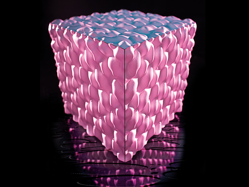 But as is true for all pleasures, nothing amplifies sensorial effect like a sense of limit. Here, each pieces of furniture is composed of two distinct geometric systems- the glistening, wet form of the lard and the rigid orthogonal volumes which define the boundaries of each piece. The juxtaposition of these two sensibilities presents more than a blunt idea of contrast. Rather, the pairing of the minimal with the intricate is an attempt to establish a rhythmic relationship between the metered orthogonal grids and the more melodic topological surfaces within. The 'Lard Series' makes no claim to break to break from the easy markers of Euclidean space. Instead, it embraces both a sense of defined regulation and a perverse appreciation for irregular, lard-like form.