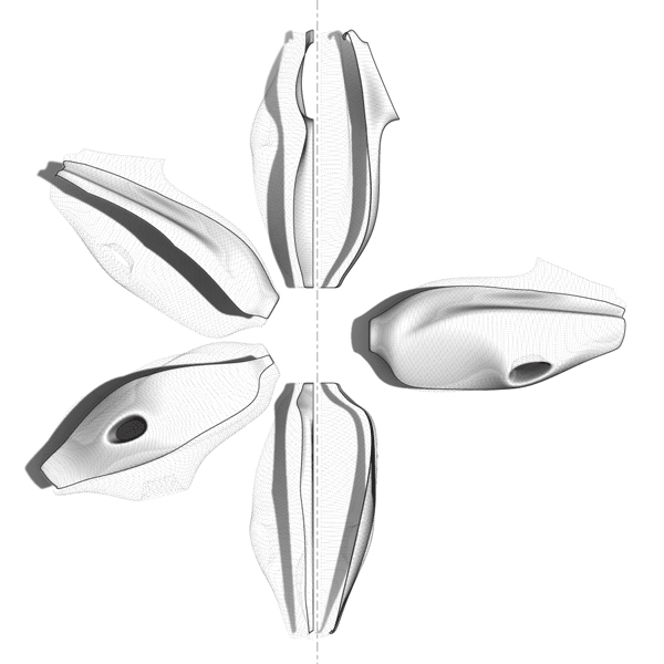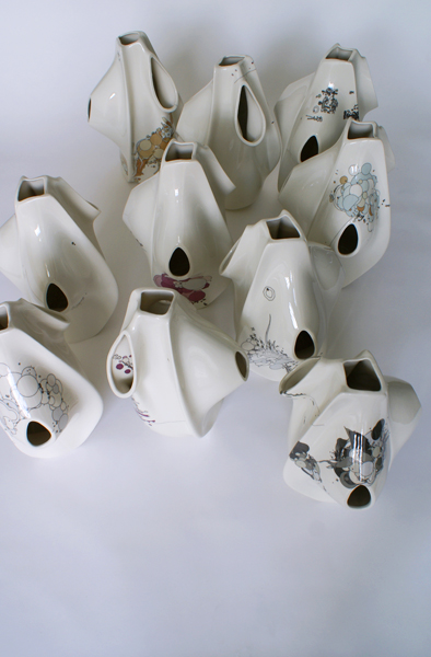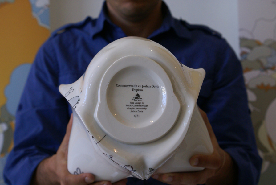 Through an ongoing relationship with Boehm Porcelain, a historic ceramic studio which has a long history of creating porcelain sculpture for the U.S. White House, to work with us on the translation of our SLA models to a fine bone Porcelain. This production method was an attempt to leverage techniques and processes natural to computation while combining that with the precision of a timeless material output. Illustrations by Joshua Davis were printed as sheets of ceramic paint which were fired in to the surface of each bespoke vase.